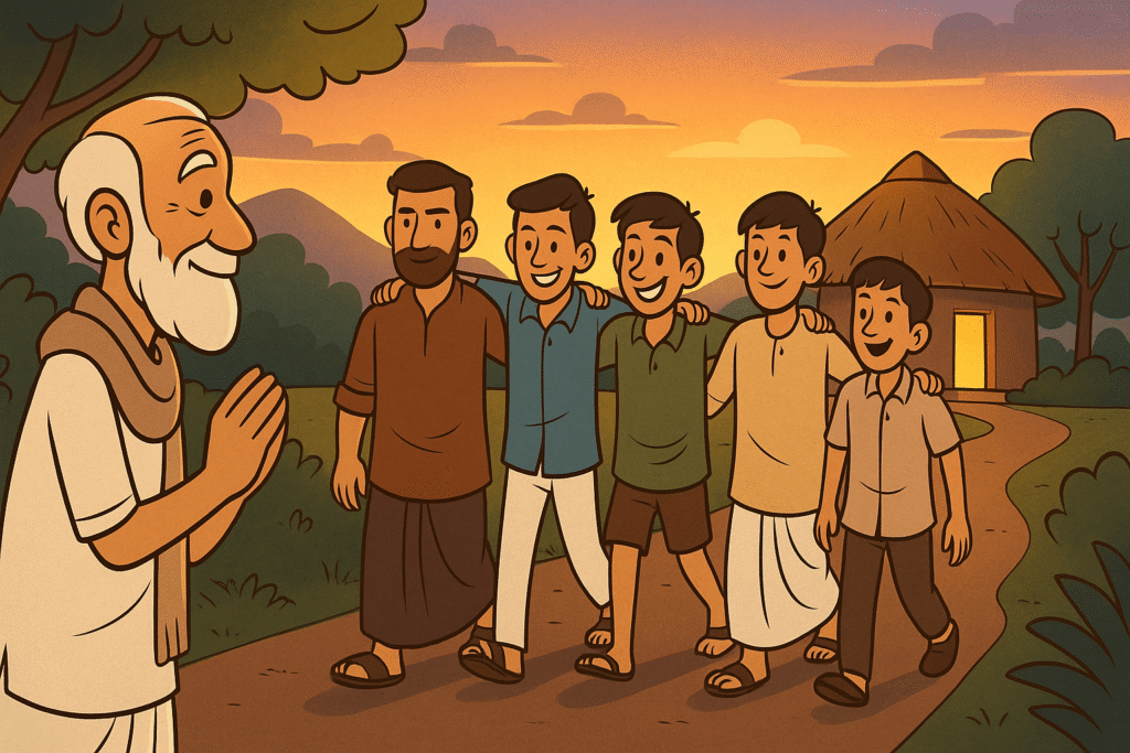 A father teaches his constantly bickering five sons a valuable lesson about unity: individually, single sticks are easily broken, but when bound together, they are unbreakable. This demonstrates that there is strength in togetherness, and unity ensures protection and resilience.