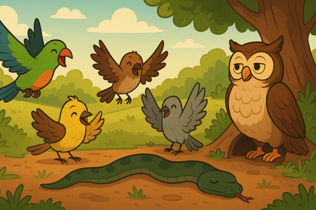 Cleverness triumphs over brute force as an old owl guides desperate birds to outsmart a predatory snake, proving that wit can overcome a physically stronger foe. The story highlights that strategy and intelligence are often more effective than raw power in overcoming obstacles.