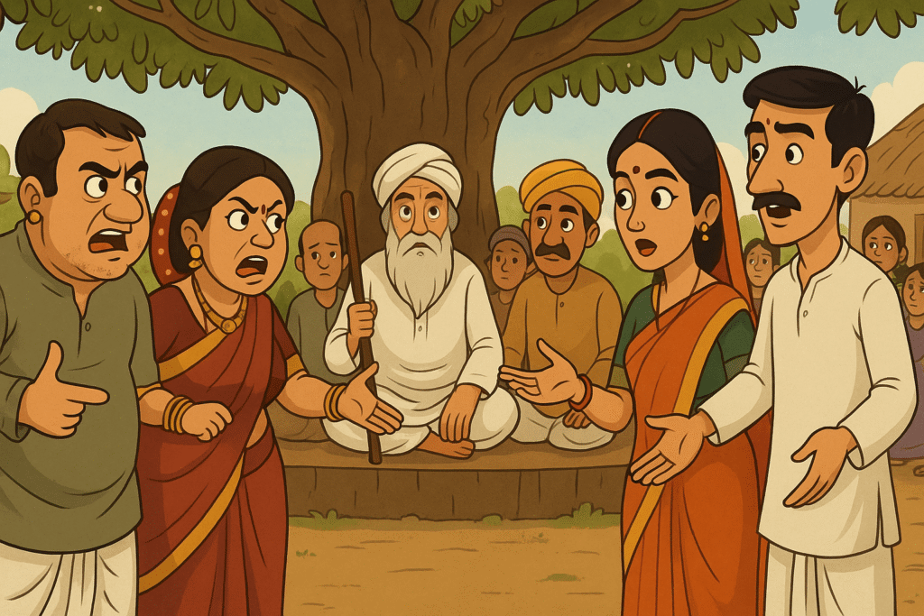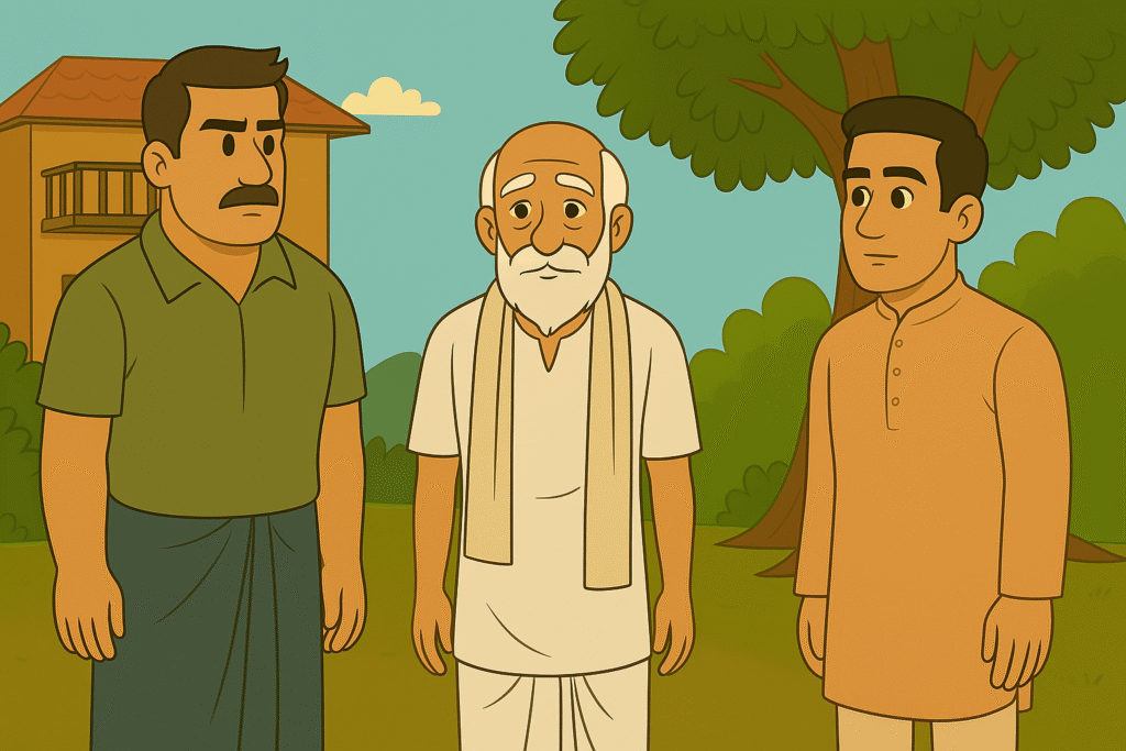 Two brothers divide their inheritance, with the clever older brother taking the fruit-bearing top of a mango tree while giving the bottom to his sibling. The younger brother, however, foils his plan by threatening to chop down the tree’s base, making the older brother realize his mistake and apologize.
