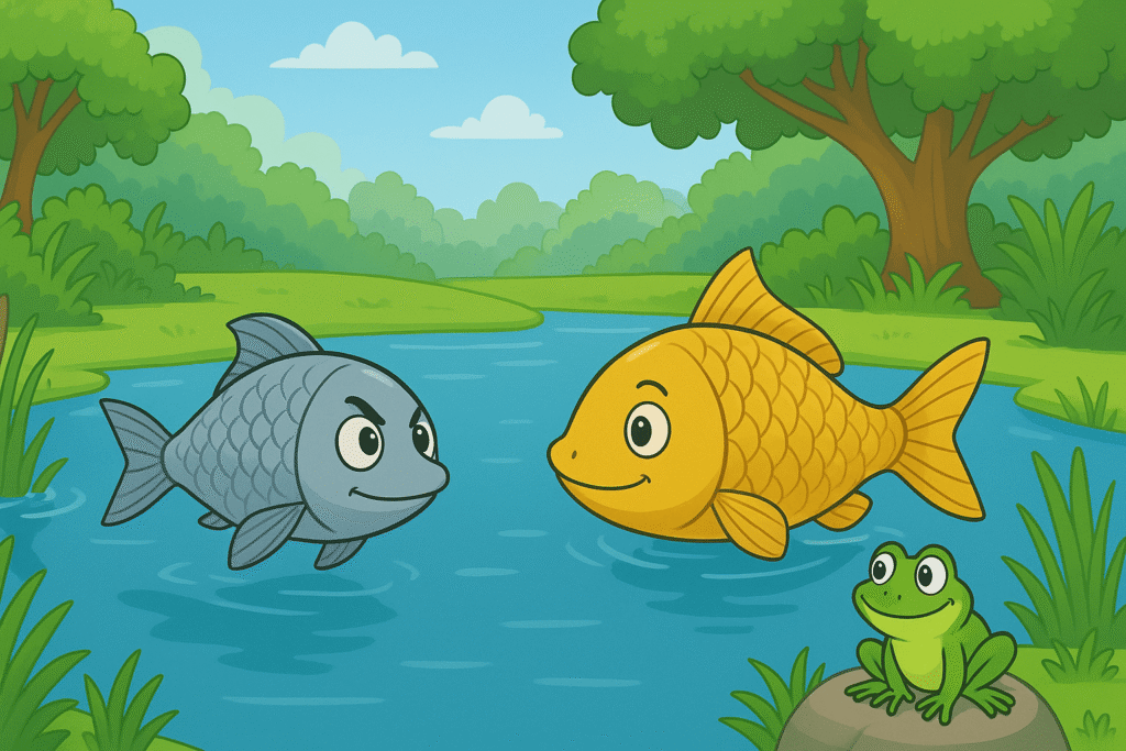 A frog, foreseeing danger from fishermen, advised his two fish friends to leave their lake. However, the fish arrogantly refused to leave their home, and the next day they were caught in the fishermen’s net.