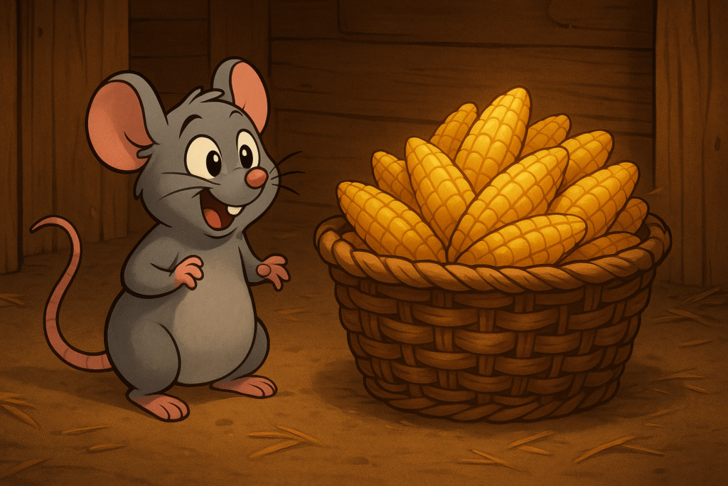 A greedy mouse, after eating his fill of corn, gets trapped in a basket due to his swollen stomach. He repeats the mistake the next day and is eaten by a cat, showing that excessive greed leads to one’s downfall.