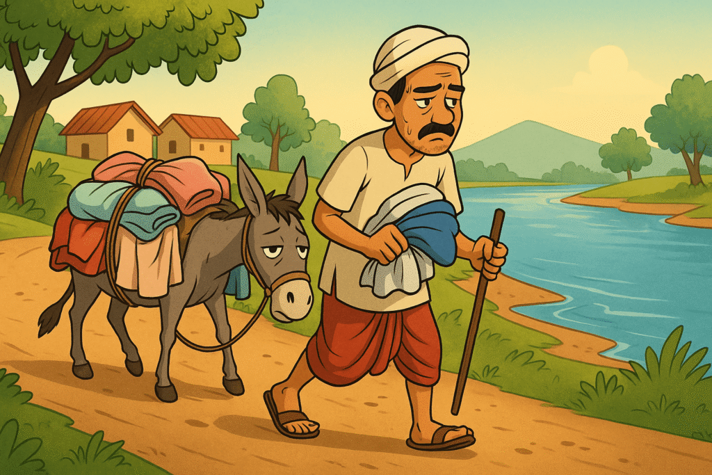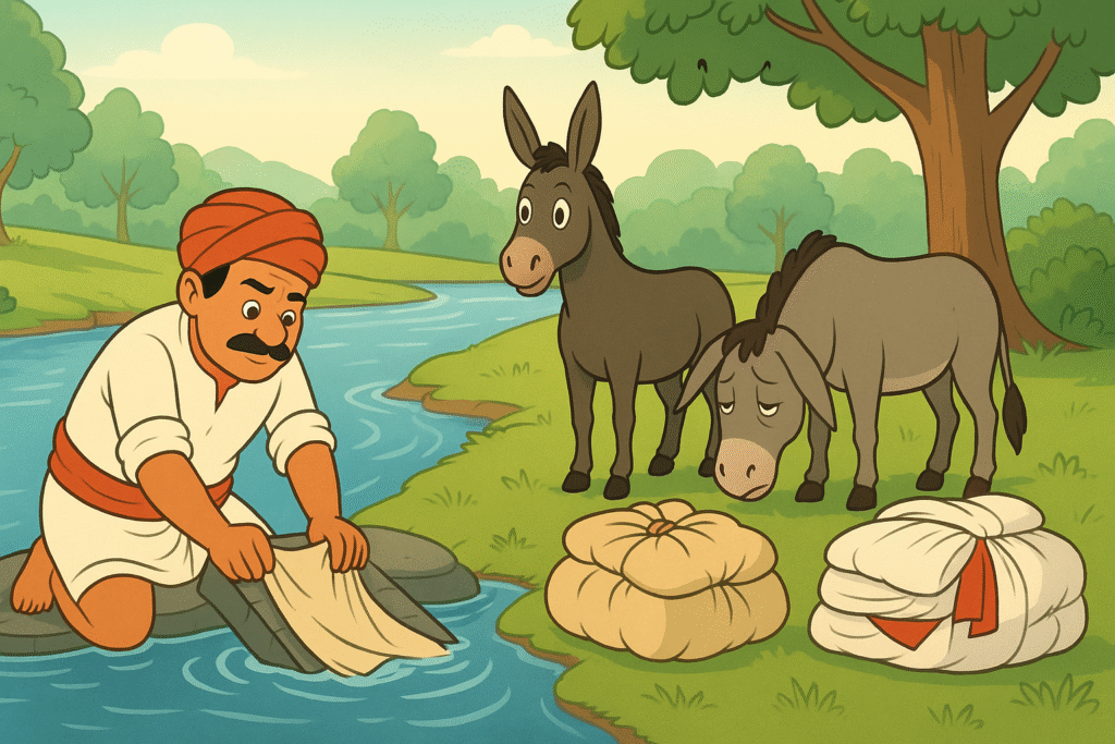 A selfish donkey refuses to help his sick companion by sharing his load. When the sick donkey collapses, the washerman places the entire burden on the unhelpful donkey, who is then left to carry it all himself.