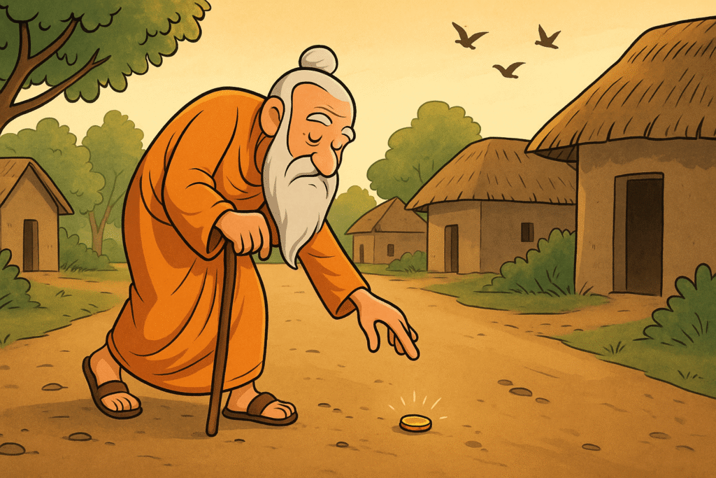 A sage finds a silver coin and searches for someone with a craving for more. He gives it to a king who is about to wage war for more territory, making the king realize his greed and prompting him to abandon his destructive plans.