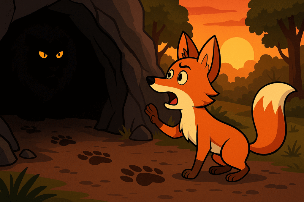 A starving lion waits inside a cave for its owner, a fox, to return. The clever fox notices the lion’s footprints and tricks the lion into revealing its presence by asking the silent cave for permission to enter, allowing the fox to escape.
