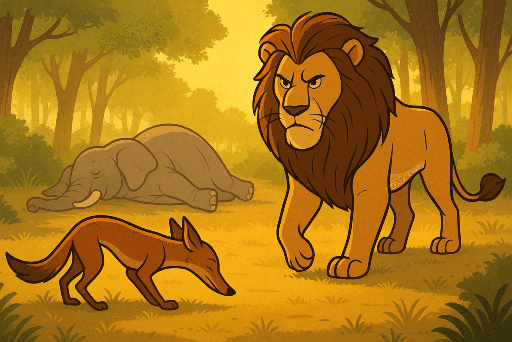 A clever fox tricks a lion, a cheetah, and a tiger into leaving a dead elephant she cannot eat alone. She succeeds and manages to eat it after fighting off another fox, but the moral of the story shifts to knowing who to respect, who to live with, and who to fight.