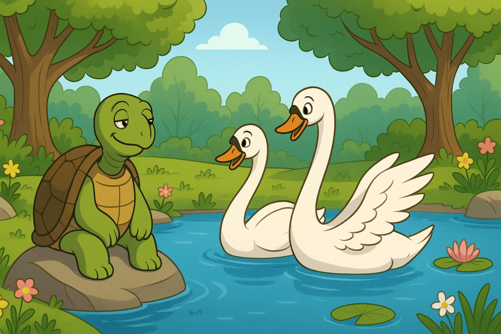 A tortoise, seeking help to move to a new pond, is warned by his goose friends not to speak during their flight. However, when villagers jeer at them, the angry tortoise ignores the advice, opens his mouth to yell at them, and falls to his death.
