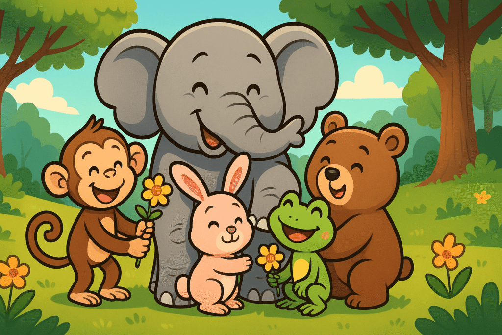 A friendless elephant is rejected by a monkey, a rabbit, and a frog for being too big and different. He later earns their friendship by courageously chasing off a lion that was terrorizing them, proving that true friendship is based on character, not appearance.