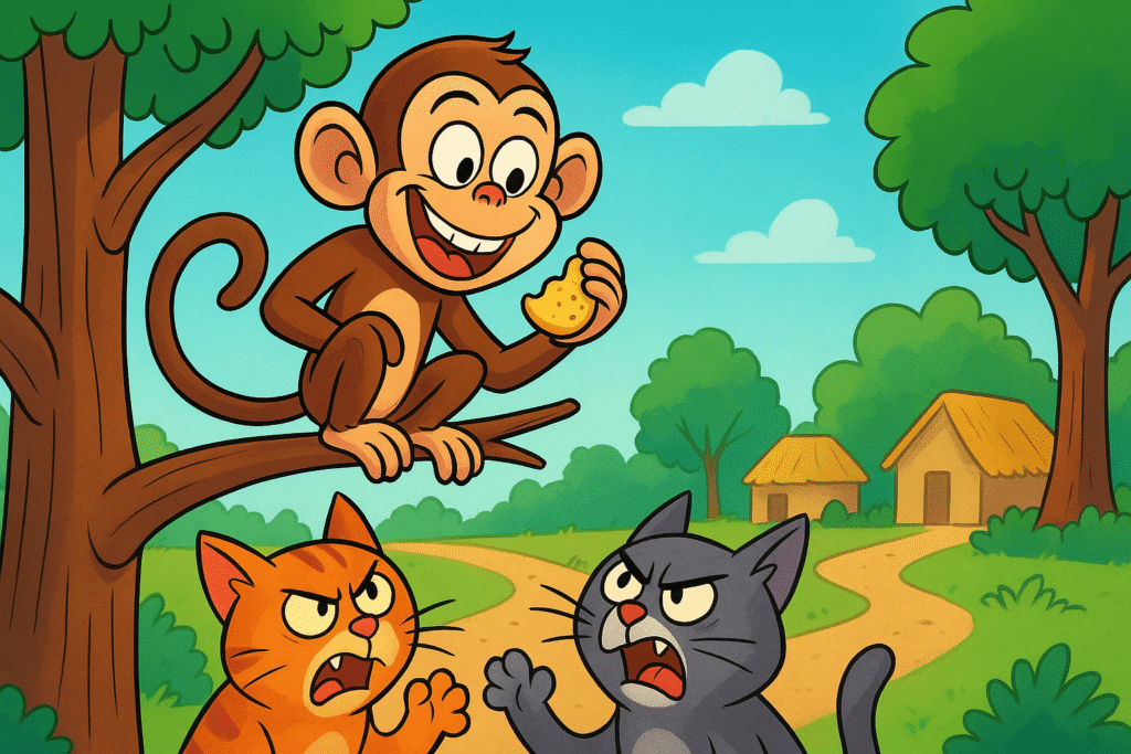 Two cats fighting over a piece of bread ask a passing monkey to help them divide it. The clever monkey eats the entire loaf under the pretense of making the portions equal, teaching the cats that when two people argue, a third party benefits.