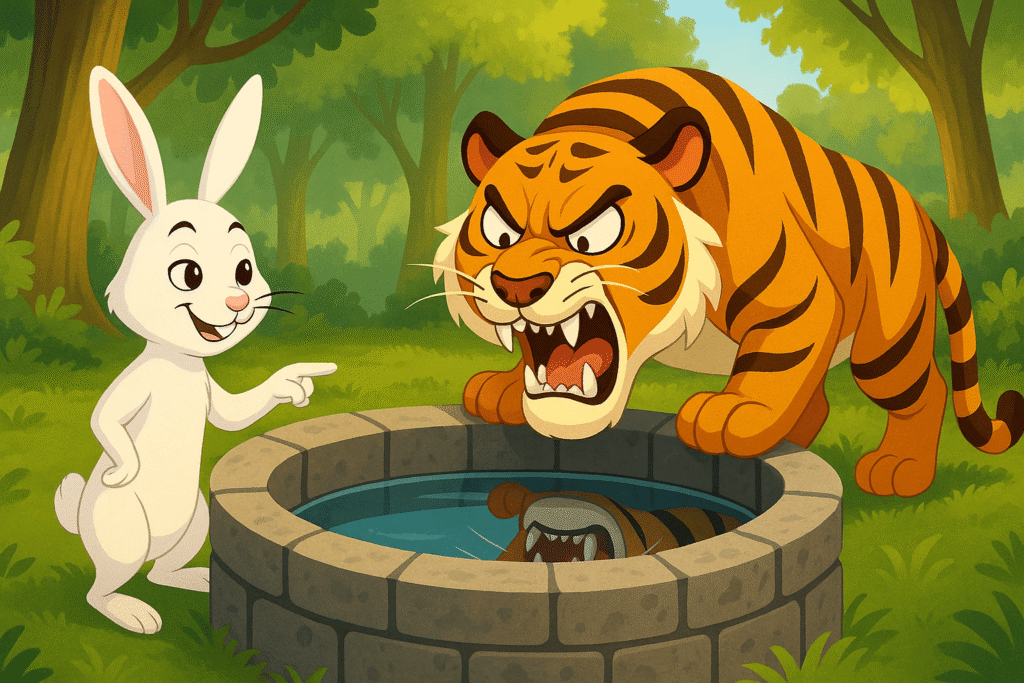 A terrified forest of animals sends a rabbit to a fearsome lion, but the clever rabbit outsmarts the lion by tricking him into jumping into a well. The story shows that wit is more powerful than brute strength.