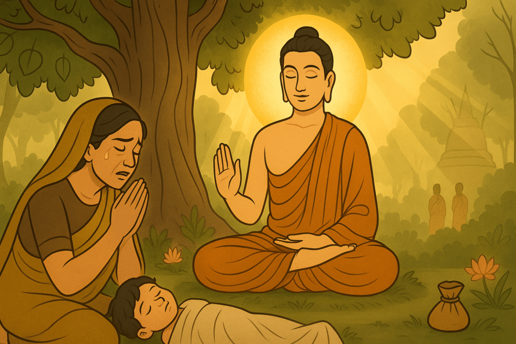 A grieving woman begs Gautama Buddha to revive her dead child. He tells her to fetch mustard seeds from a house where no one has died, making her realize the universal truth of death and helping her find peace.