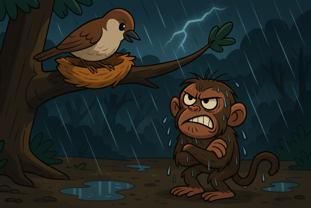 A cold, drenched monkey seeks shelter under a tree, where a sparrow in her nest advises him to build his own home. Angered by her persistent lectures, the monkey destroys her nest, teaching the lesson that unsolicited advice can be harmful to the giver.